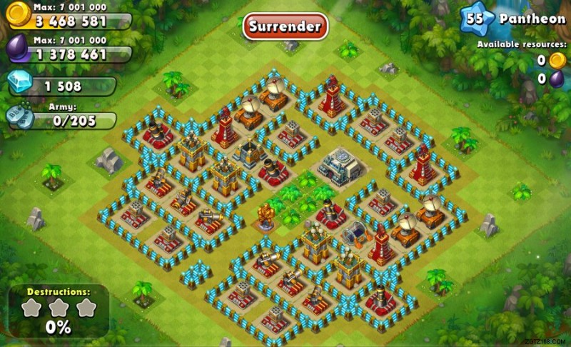 10 人のガンナー、4 つのアイアン ストーム (レベル 1)、2 つのチョッパー、10 の爆弾を訓練しました。また、クランメンバーから高レベルのパイロで満たされたクラン部隊を手に入れました。基地内の黄金の像の近くで攻撃を開始したとき、私は素早く移動しなければなりませんでした。すぐに、いくつかの爆弾を発射して、近くの壁を壊しました。私は残りの 2 つのアイアン ストームを発射し、次に残りの爆弾を発射しました。最後に、クランのパイロとチョッパーを配置しました。価格のための勝利と完全な満足。しかし、それだけの価値はありました。