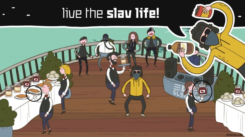ウェイターが持っているパイのようなものをタップしてから、トマトジュースのようなものをタップします。ボリスが踊り始め、レベルが完了しました!