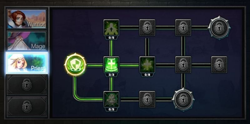 そこにはたくさんのオプションがあり、使用するスキルポイントはほとんどないため、常に慎重に選択する必要があります.個人的には、戦士のダメージに少し投資した後、プリーストのスキルに集中することにしました。私の意見では、ボス戦では回復が非常に重要です。