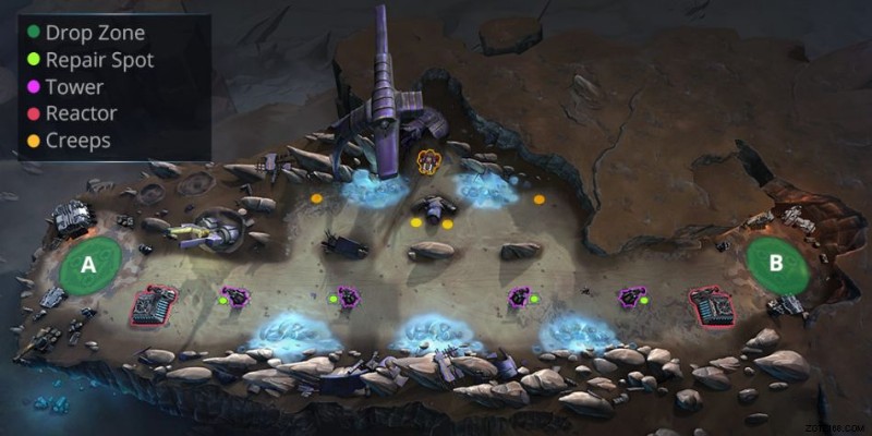 ここでは、マゼンタ色の塔が各チームに 2 つあります。 A 側 (左) のプレイヤーは B 側のリアクターを破壊する必要があり、B 側 (右) のプレイヤーは A 側のリアクターを破壊する必要があります。