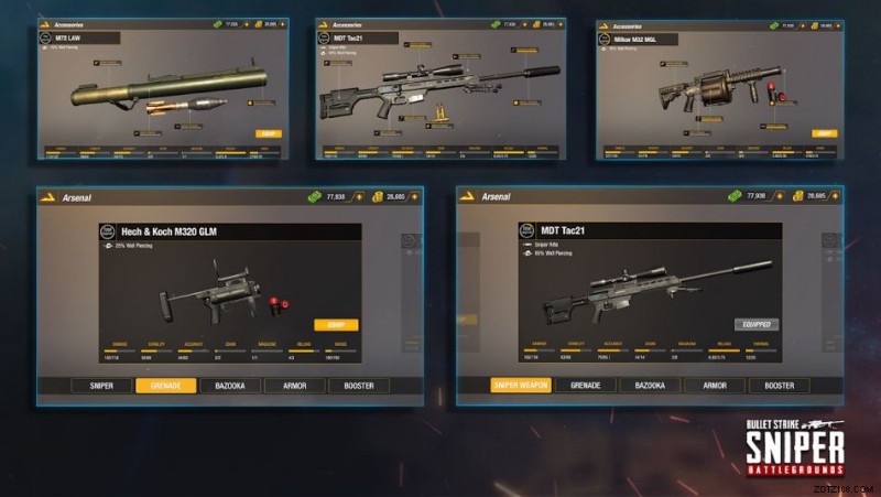 アーセナルでは、いくつかのスナイパー武器を見ることができます 、スナイパーライフル、半自動のグレネードランチャー (そうそう!) みんなを吹き飛ばす バズーカ 、防具 とブースター パック .これらはすべてコインまたは現金でロックを解除できますが、より高度なものの中には、購入する前に以前の同様の武器を所有する必要があるものもあります.