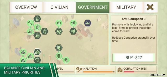 腐敗は購入(およびゲーム内で発生するさまざまなランダムイベント)によっても増加するため、それもチェックする必要があります.これを行うのは少し難しいですが、腐敗に対する強力な武器があります。腐敗防止ブランチの政府の活動です。これらのロックを常に解除しておけば、この分野でも問題はありません!