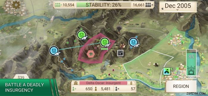 軍隊 :反乱軍との戦いに完全に焦点を合わせたこのオペレーションには、長所と短所があります。軍隊を編成して反乱軍を統制下に置きたいと考えていますが、同時にこれには費用がかかり、地域を安定させるというあなたの仕事をより困難にしています.