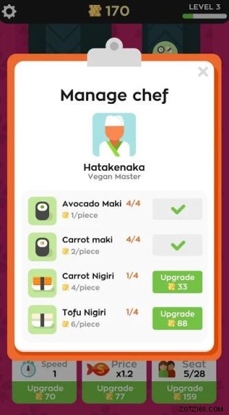 – スピード (1 – 10): 基本的にレストラン全体の速度を上げます。料理人はより速く仕事をこなし、コンベア バンドは何倍も速く動きます。