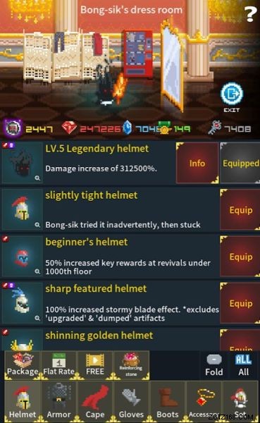 – アーティファクト: これらは、フロアをより速く通過し、より良い報酬を得るのに役立ついくつかのアイテムであり、一般的にゲームで役立つものです.アーティファクトは 3 つの方法でアップグレードできます:キー (両方のタイプ) または実際のお金です。したがって、本当に早くレベルアップしたい場合は、いくつかのオプションがあります。