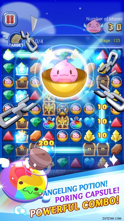 天使のポーション 5 つの宝石を一致させると作成されます。この赤ちゃんを任意の宝石と交換して、ボード上のその色のすべての宝石を即座に一致させます。 Angeling Potions は簡単にレベルを上げることができるので、作る機会があれば賢く使ってください!