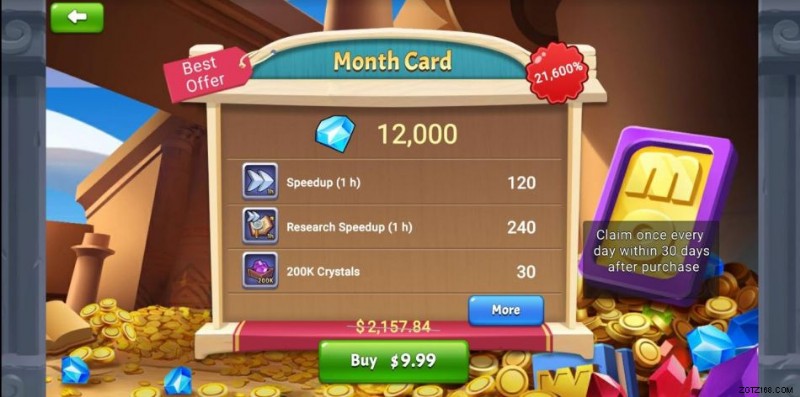 言及する価値があると思うもう 1 つのパックは月間カードです。これにより、合計 12000 ダイヤモンド、120 時間相当のスピードアップ、240 時間相当の研究スピードアップ、および数百万のリソースが得られます。このオファーでは、購入から 30 日以内に 1 日 1 回グッズを請求できるため、9.99 ドルでかなりお得です。