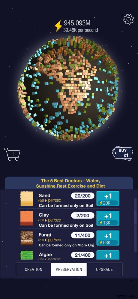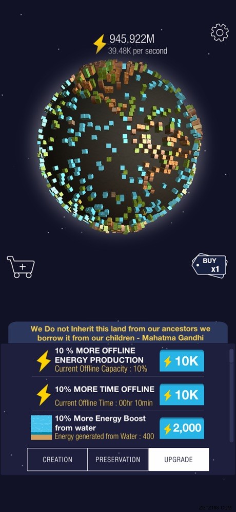 オフラインのアップグレードに加えて、惑星の特定の部分が生成するエネルギーの量を増やすアップグレードがあります。たとえば、地球上にある水の量から得られるエネルギー量を増やすアップグレードがあります。
