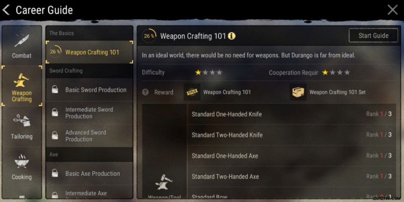 武器作成でキャリア ポイントを獲得したい場合は、 武器に集中する必要があります / ツール そして遠距離 これらは、武器作成で得られるポイントを増やすためです。ここでは道具を作るだけでEXPが増えていきますが、道具を作るには素材を集める必要があるので、パターンが見えてくるかもしれません。