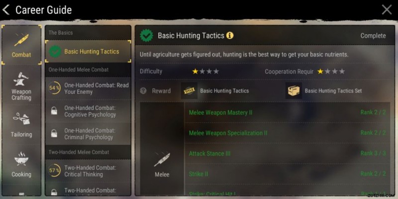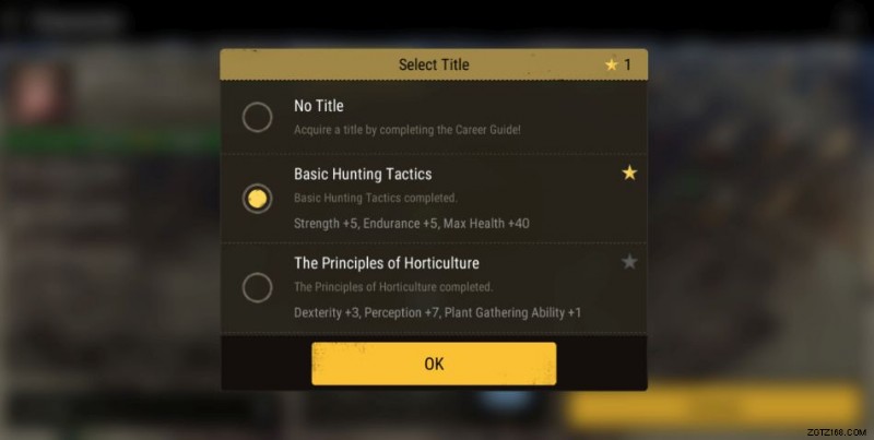 キャリアを完了すると、多くの場合「キャリアガイドの完了」として表示され、報酬として特別な称号が与えられます。キャリアを完了することで得られる称号は、Strength +5、Endurance +5、Max Health +40 (Basic Hunting Tactics から) などの特定のステータスを与えます。