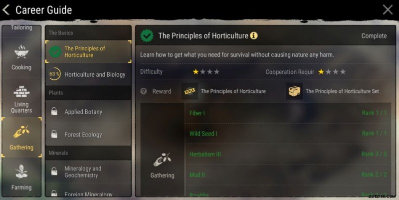 たとえば、ギャザリング -> 園芸の原則をレベルアップしたい場合は、次のものが必要です: