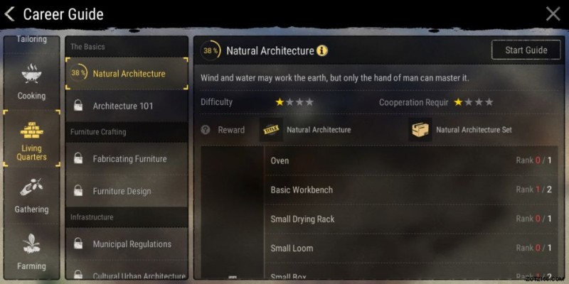 リビング クォーターでキャリア ポイントを獲得したい場合は、 必要なのは建設だけです そして処理。 これにより、オーブンから椅子など、現代人が使用する便利な日常アイテムをすべて作成できます。その後の処理は非常に簡単になるため、建設レベルを上げることに集中してください。