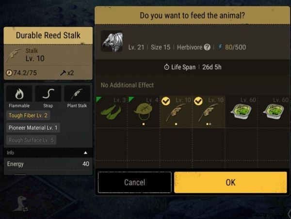 あなたのペットは、より多くのエネルギーを得るために餌を与えなければなりません(彼らの場合は活力と呼ばれます).ゲームで恐竜に餌をやるには、最初にインベントリに食料の一部であるたくさんのアイテムを用意する必要があります:草食のペットを飼っている場合は、果物や葉などが必要ですが、肉食のペットは肉と同様の動物性食品のみを食べてください。