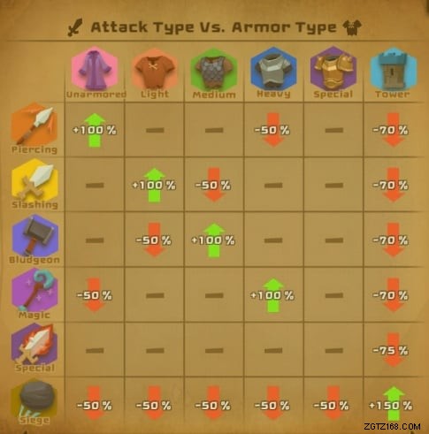 ほぼすべての攻撃と防具の種類に長所と短所があることに注意してください。どの部隊が何を持っているかを知り、どのタイプで対応するかを知ることが戦闘の鍵です!このため、すべてのタイプをカバーできるように、バランスの取れた部隊セットを用意することが重要です。
