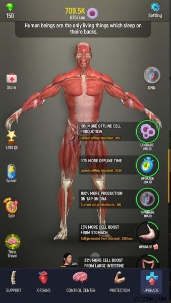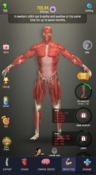 – 画面上部に表示されている数字があなたの DNA です。それは時間の経過とともに増加し、人体に影響を与えるゲームで実行するすべてのアクションは DNA を消費します。