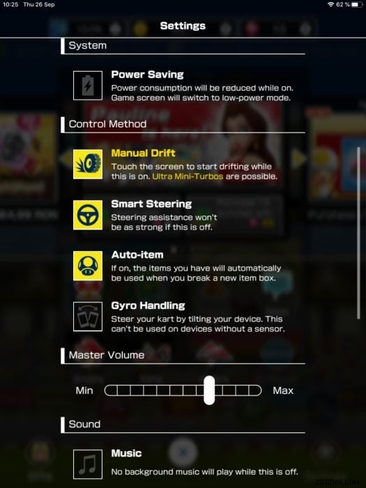 手始めに、オンとオフを切り替えることができる手動ドリフトがあり、カートの操縦方法が完全に変わります。このオプションがオンの場合、左または右にスワイプしてドリフトし、リリースして前進する必要があります。