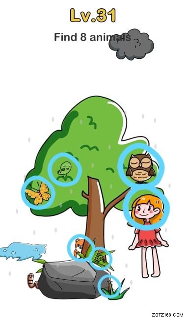 A:まず、雲をタップして8匹目の動物を出現させます。次に、岩の近くのワームだけをタップせずに、それらすべてをタップします (以下を参照)。