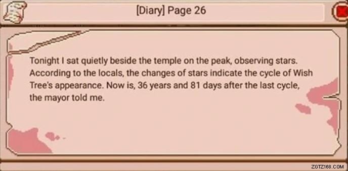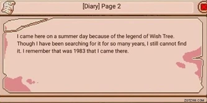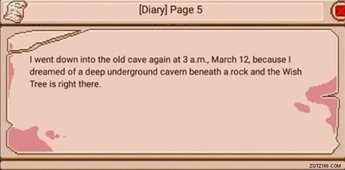 テキスト:「今日は 17 日を迎える ハーベスト タウンでの生活の 2 週間目、これで 38 ウィッシュツリーの洞窟探検。このまま頑張っていけるかどうかはわかりません。ウィッシュツリーが本当に存在するかどうかを疑うようなものは今のところ何も見つかっていないことを知っているからです.