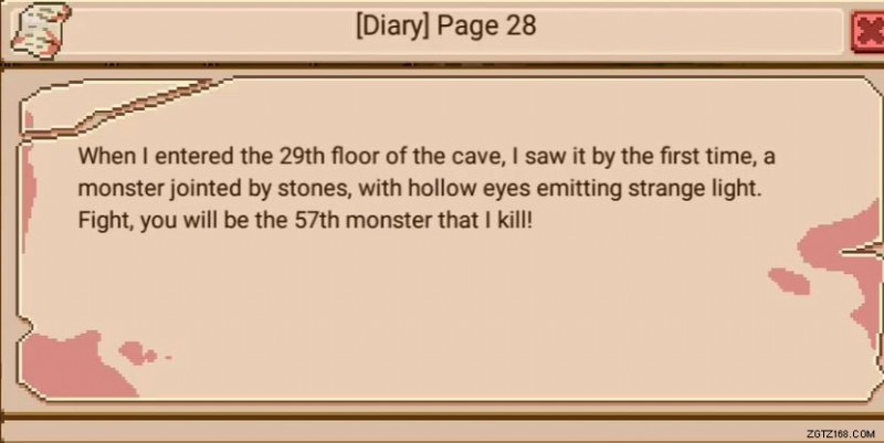 テキスト:「29に入ったとき 洞窟の 3 階で初めて見た、石でつながれた怪物で、くぼんだ目から奇妙な光を放っていた。戦え、君は 57 になる 私が倒すモンスター!」