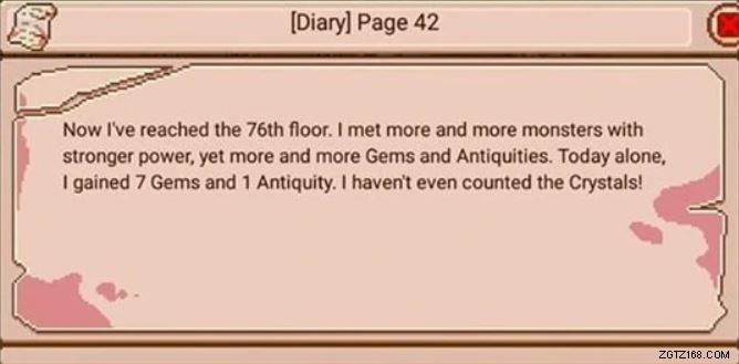 テキスト:「これで 76 に到達しました 階。ますます強力な力を持つモンスターに出会い、さらに多くの宝石と骨董品に出会いました。今日だけで 7 獲得しました 宝石と 1 古代。クリスタルも数えていません!」
