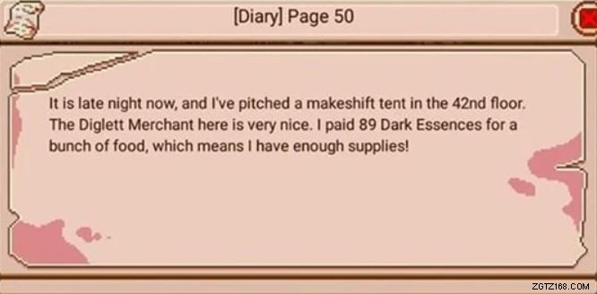 テキスト:「今は深夜です。42 に間に合わせのテントを張っています。 2 階 ここの Diglett Merchant はとてもいい人です。 89 支払いました ダーク エッセンスでたくさんの食料が買えるってことは、十分な物資があるということです!
