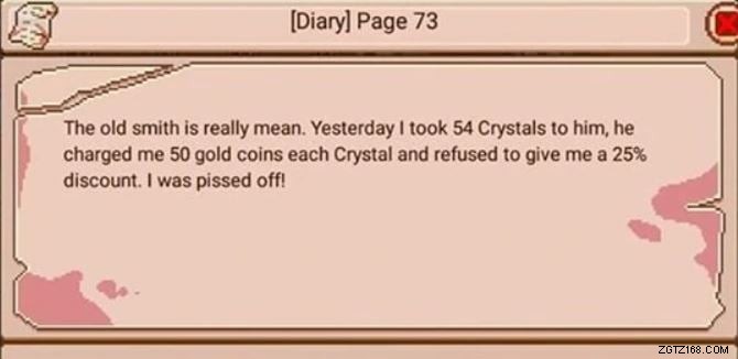 テキスト:「古い鍛冶屋は本当に意地悪です。昨日は 54 を取りました 彼にクリスタル、彼は私に 50 を請求しました クリスタルごとにゴールド コインを受け取り、25 を与えることを拒否しました % 割引。私は怒っていた!