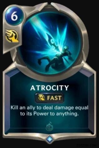 攻撃時に使うカードです。召喚したユニットが0体で、敵の防御が準備されていないときに、最強のカードが死んでいるときにプレイするのに適したカードです.これは、対戦相手のネクサスに大きな打撃を与える可能性があります。