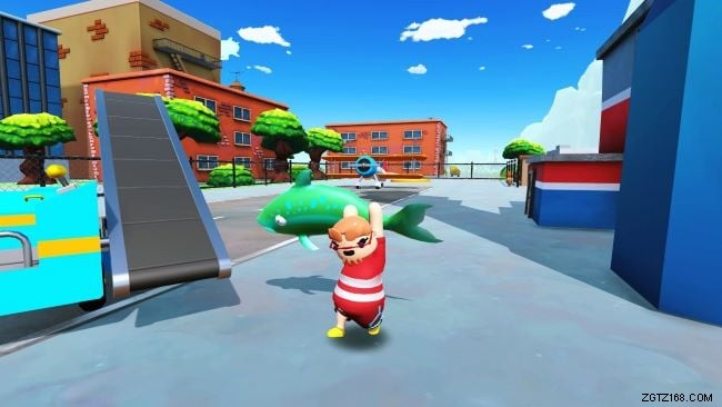 This one is a little tricky and plenty wacky! For this delivery, you need to launch a giant fish onto a delivery chute on the side of a building way up high. To accomplish this, you will be granted access to the blue conveyor belt truck.
