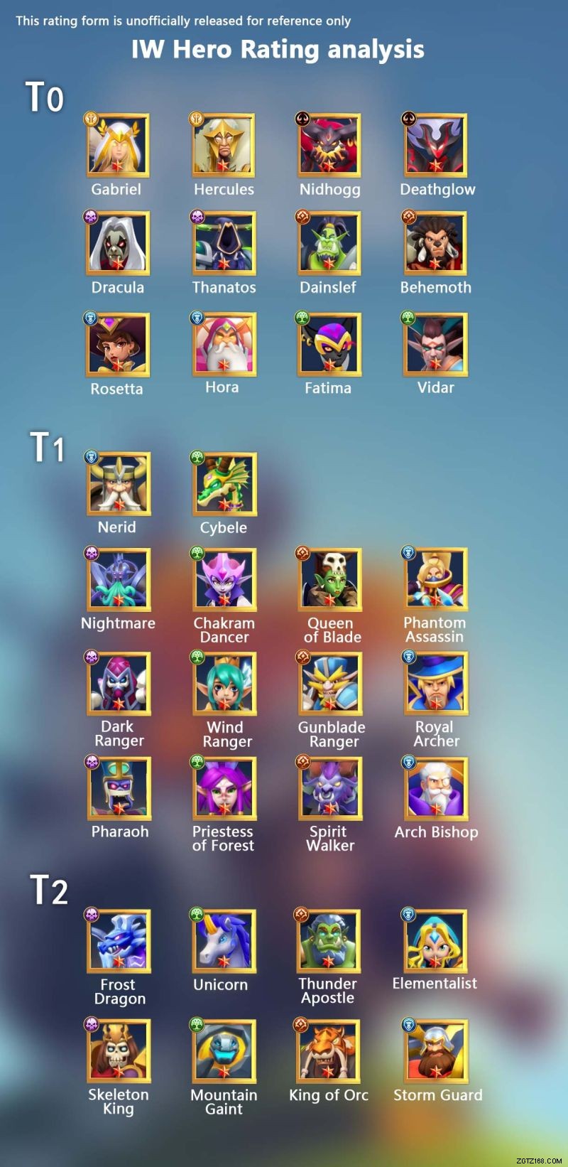 作業をさらに簡単にするために、Tier リストの下に画像形式を用意していますが、文字形式でも文字列を表示できます。しかし、これ以上苦労することはありませんが、これが私たちの Idle War Legendary Heroes ティアリストです: