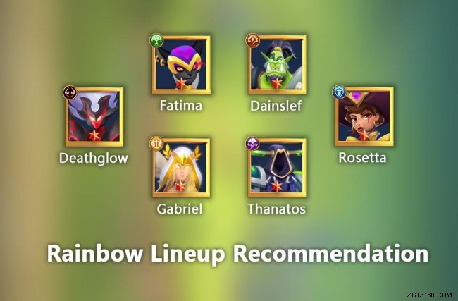 Rosetta、Deathglow、Fatima、Dainslef、Thanatos、Gabriel が私のおすすめです。最初の 5 人はすべて非常に強力な DPS キャラクターです。さらに、Rosetta のデバフはこのラインナップ全体に非常に役立つ可能性があり、チームが簡単に勝利を収めるのに役立ちます.