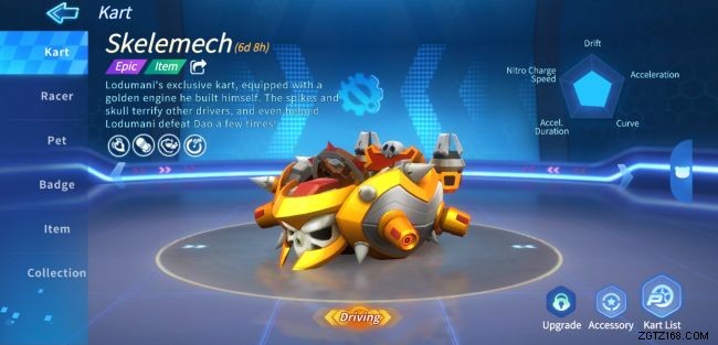 各カートはユニークで、上記のような多かれ少なかれボーナスに加えて、加速、カーブ、ドリフト、ニトロ速度、加速持続時間のカテゴリの基本統計があります.