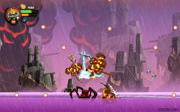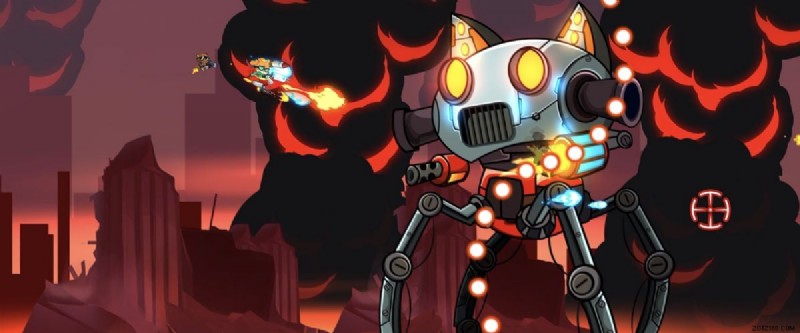 One early example of a tough boss is mission 13’s Bark Meow. This guy will rain small bullets upon you, but eventually he will move to the center of the arena and fire a powerful laser that has insane tracking abilities.