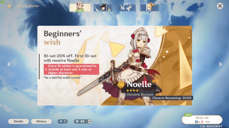 プレイヤーは初心者のウィッシュ バナーを使用して、ノエルのロックを解除できます。ゲームをダウンロードすると、ガチャを 1 回または 2 回使用するのに十分な通貨が得られます。彼女は確実にドロップするので、ノエルのバナーでそれらを使用してください。