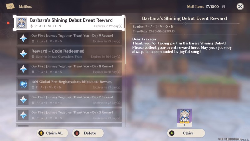 Barbara のロックを解除するには、プレイヤーはアドベンチャー ランク 20 に到達する必要があります。AR ランク 20 に到達すると、Barbara を無料で入手できます。ゲーム内メールにキャラクター「バーバラ」が送られてきます。そこで彼女を手に入れて、「ハイドロ」属性ダメージを与えるために彼女を使い始めることができます。