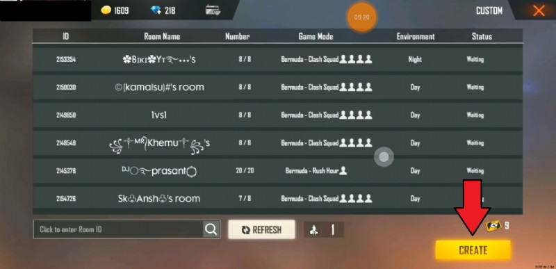 Free Fire アカウントにルーム カードを追加したら、次の手順に従ってカスタム ルームを作成し、友達と対戦してください。