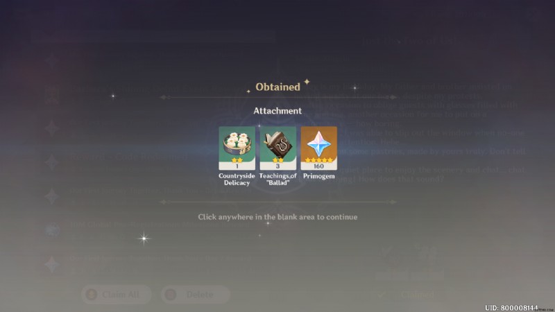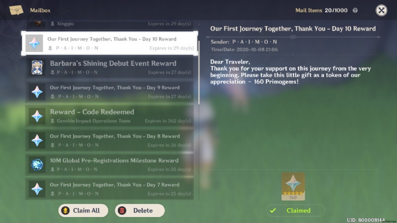 Genshin Impact は、無料でプレイできるプレイヤーでもやりがいのあるゲームです。プレイするだけで、160個以上のプリモジェムを無料で提供することがよくあります。多額の事前登録報酬とは別に、プレイヤーは毎日 160 の primogem を取得できます (少なくとも今のところ)。ゲームを開いて、ゲーム内メールにアクセスするだけです。 「すべて請求」 をクリックします 保留中の報酬を引き換えます。