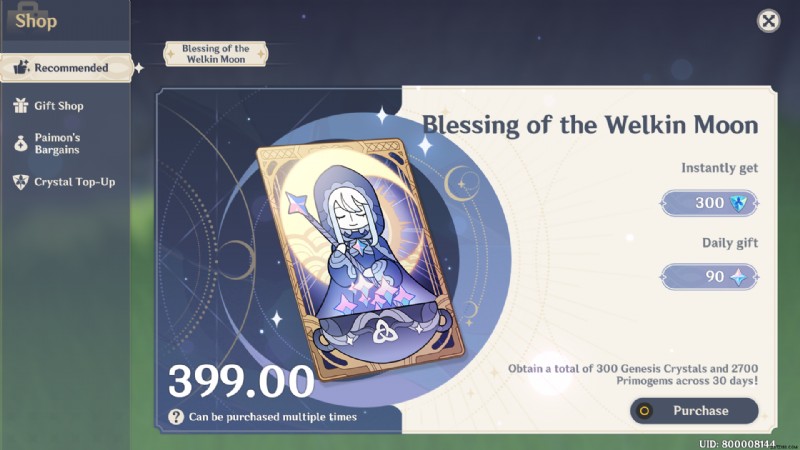 Blessing of the Welkin moon は、Genshin Impact の月額サブスクリプション パックです。プレイヤーに 300 ジェネシス クリスタル (サブスクライブするとすぐに) と 90 プリモジェムが毎日付与されます。このパックを購入するには、プレイヤーは 4.99 USD を支払う必要があります .月末にはプレイヤーは合計 2700 プリモジェム を持っているため、この購入をお勧めします。 つまり、(ほぼ) 20 のウィッシュに使用できます。