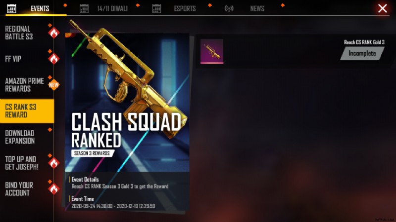 プレイヤーは、クラッシュ スクワッド モードでランクを上げることで、Free Fire で無料の Golden Famas スキンを入手できます。イベント ルールにより、プレイヤーは CS ランク シーズン 3 ゴールド 3 に到達する必要があります。 報酬を得るために。プレイするには、メイン画面のモード選択メニューに移動し、Clash Squad モードを選択します。