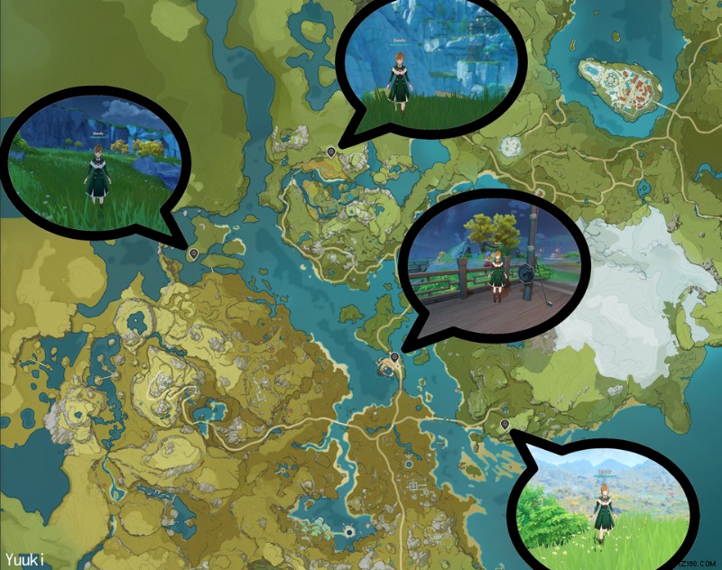 Dandy は、現在利用可能な Teyvat のオープンワールド マップの 4 つの異なる場所で同時に利用できます。 .タイムトライアルを開始するには、プレイヤーはダンディと話し、会話を使い果たす必要があります。その後、プレーヤーには白い円形のリングで表される滑走路が表示されます。