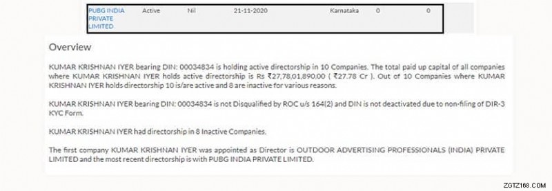 同社はまた、11 月 21 日に 2 人の取締役を任命しました – Kumar Krishnan Iyer と ヒョニル ソン PUBG INDIA PRIVATE LTDの場合。これにより、同社は現在、取締役を介して他の8つの企業に接続されています。