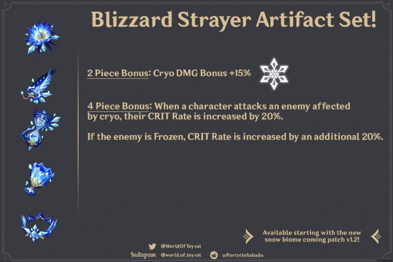 Blizzard Strayer Artifact Set は、Genshin Impact の Cryo Generalist セットです。 これにより、クライオ ダメージ ボーナスと CRIT 率が増加します。