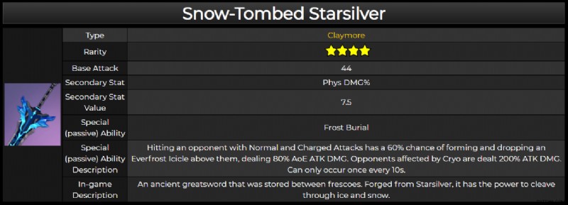 Snow-Tombed Starsilver Claymore は 44 の基本 ATK DMG を備えており、この武器の副ステータスは Physical DMG% が 7.5% 増加します。武器の特殊能力は Frost Burial と呼ばれ、Dragonspine Spear と同じ説明を共有します。