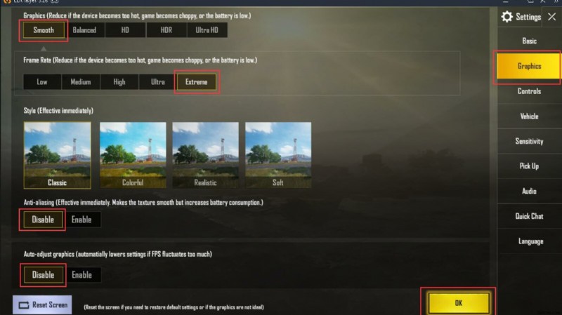 PUBG Mobile で最適なグラフィック設定を使用する 全体的な FPS を向上させます。ただし、共有するリソースが少ないローエンドの携帯電話を使用しているプレイヤーにとっては、最小限のグラフィック設定が最適なオプションです. PUBG Mobile で高い FPS を得る唯一の主要な方法であるため .