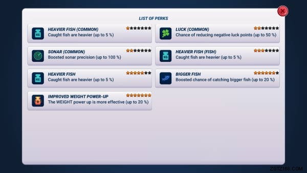 ロッドの主なアップグレード要素は特典です。 1つ星のロッドには特典用のスロットが1つあり、キャッチした魚をより重くするなど、受動的な特典をロッドにランダムに割り当てる無料のドローを実行できます.特典が気に入らない場合は、再ロールできますが、これにはパールがかかるため、現時点では再ロールすることはお勧めしません.特典の完全なリストは次のとおりです: