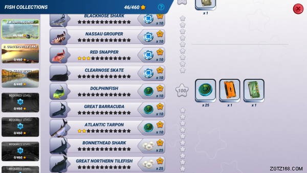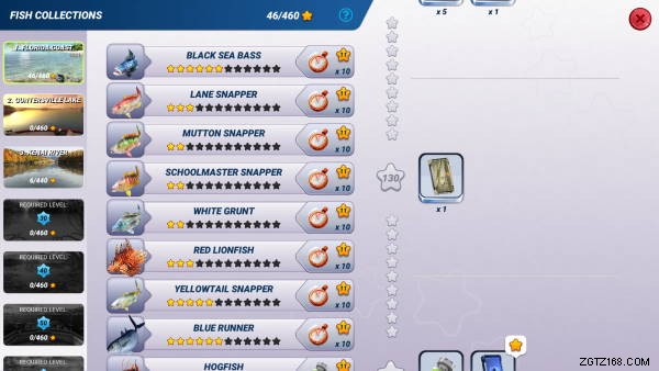 真珠を入手して魚のコレクションを完成させる最後の方法。キャスト ボタンの横にあるスター ボタンをタップすると、現在のロケールの釣りコレクションが表示されます。より多くのポイントに値する魚を捕まえると、コレクションに星が追加されます。1 種類の魚ですべての星を獲得すると、パワーアップと真珠が与えられます。