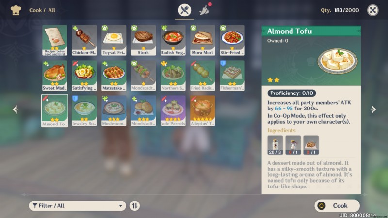 ロールプレイング ゲームとして、原神インパクト は、さまざまな料理レシピ、材料、アイテムなどを提供します。これは、プレイヤーが旅をするのに役立ちます。料理アイテムは通常、さまざまな種類のバフや特別なステータスを提供し、HP やスタミナを獲得するためによく使用されます。同様に、Genshin Impact の杏仁豆腐 ATKバフを提供する食料品です パーティメンバー全員に。