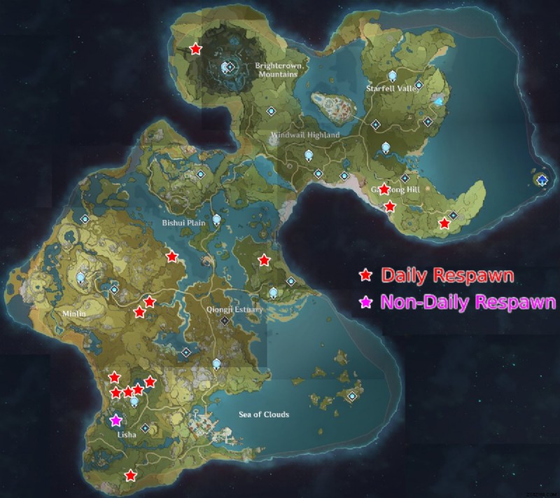 プレイヤーは、Genshin Impact で Liyue 地域全体で Fatui Skirmishers を見つけることができます .ただし、上記のマップでは、プレイヤーは上記の場所でファトゥイの小競り合いに遭遇することが保証されています。