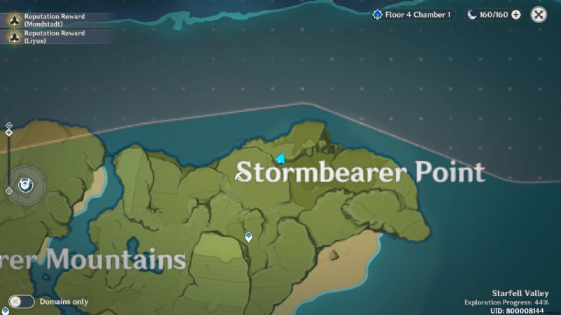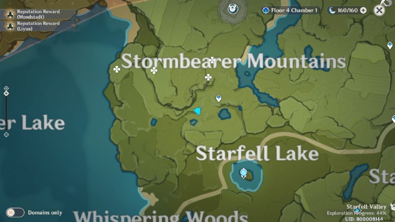 Stormbearer Mountains テレポートのウェイポイントに移動し、上のマップに示されているように、プレイヤー アイコンに向かって進みます。そこには 3 つのジオスライムがいます。