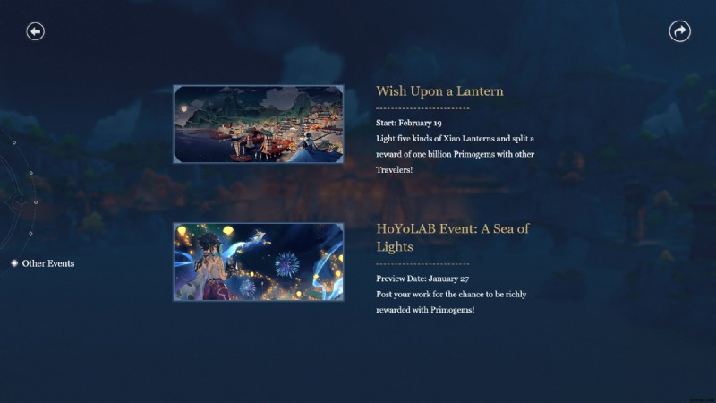 原神インパクト 1.3 プレビュー ページを更新 、「その他のイベント」があります 」タブでは、プレイヤーは 2 つの新しい今後のイベントを見つけることができます。 1 つ目はランタンに願いを、2 つ目は HoYoLAB イベント:光の海です。 、これは Genshin Impact です のファンアートコンテストが開催中です。