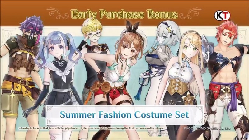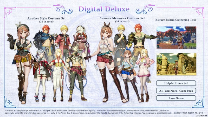 ゲームのデジタル デラックス エディションには、さらに 2 つのセット、アナザー スタイル コスチューム セットがあります。 (全21着)と夏の思い出コスチュームセット (全16着)。また、プレイヤーがゲームを早期購入すると、ライザのサマー アドベンチャー コスチュームを入手できます。 無料で。また、ゲームをデジタルで事前注文したプレイヤーは、ライザのディベルティメントの抱擁コスチュームを入手できます 無料で。